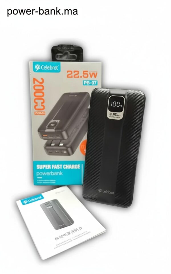 Le Celebrat PB-07 Power Bank 20000mAh 22.5W est une batterie externe haute capacité conçue pour les utilisateurs exigeants. Avec sa technologie de charge rapide 22.5W, sa grande autonomie et ses multiples ports, il est parfait pour recharger vos smartphones, tablettes et autres appareils en un temps record.